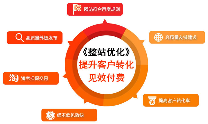 整站优化服务主要针对新站或关键词转化率低的网站进行的长期优化服务.最低优化期限为一年,我们保证关键词排名效果,支持淘宝交易,见效付费!